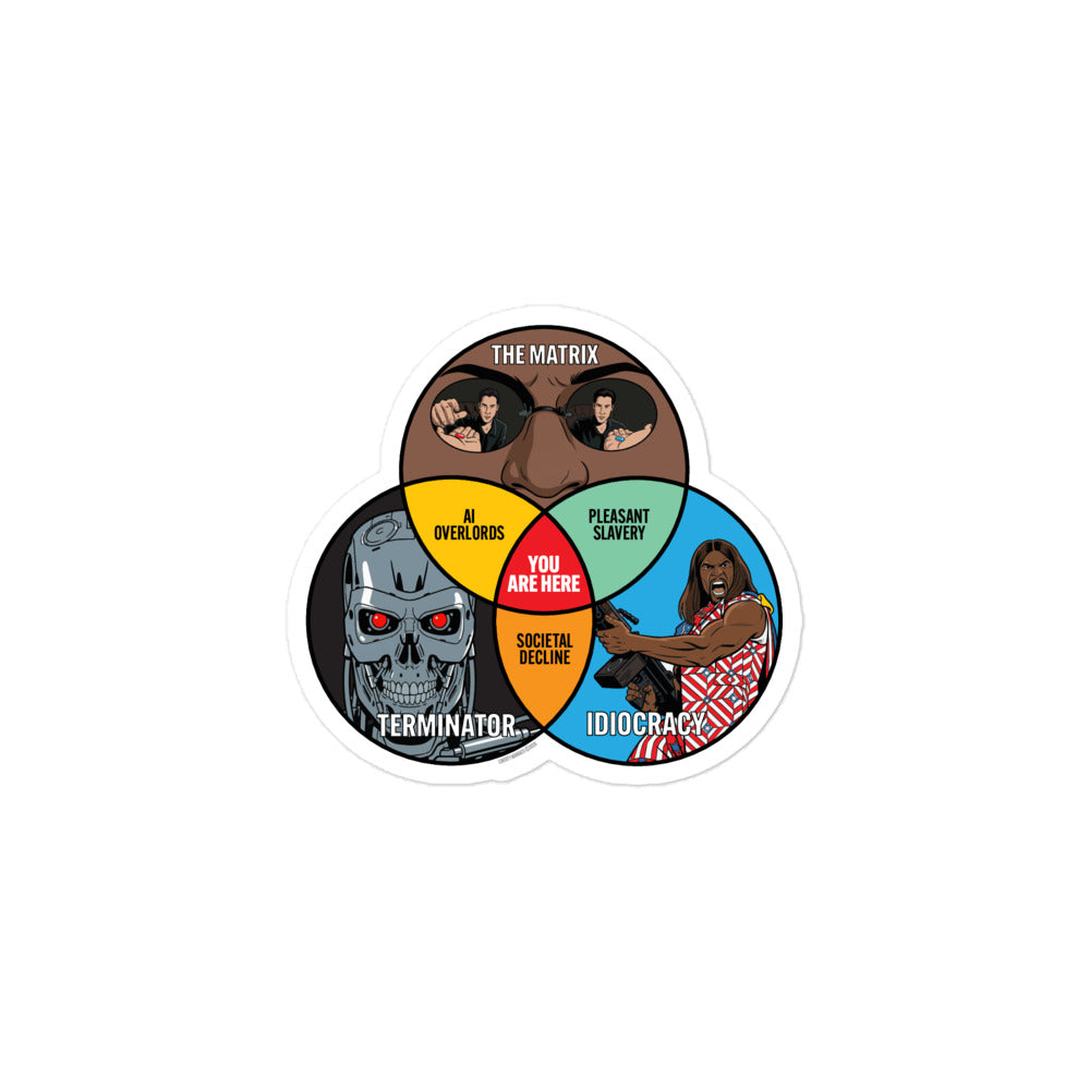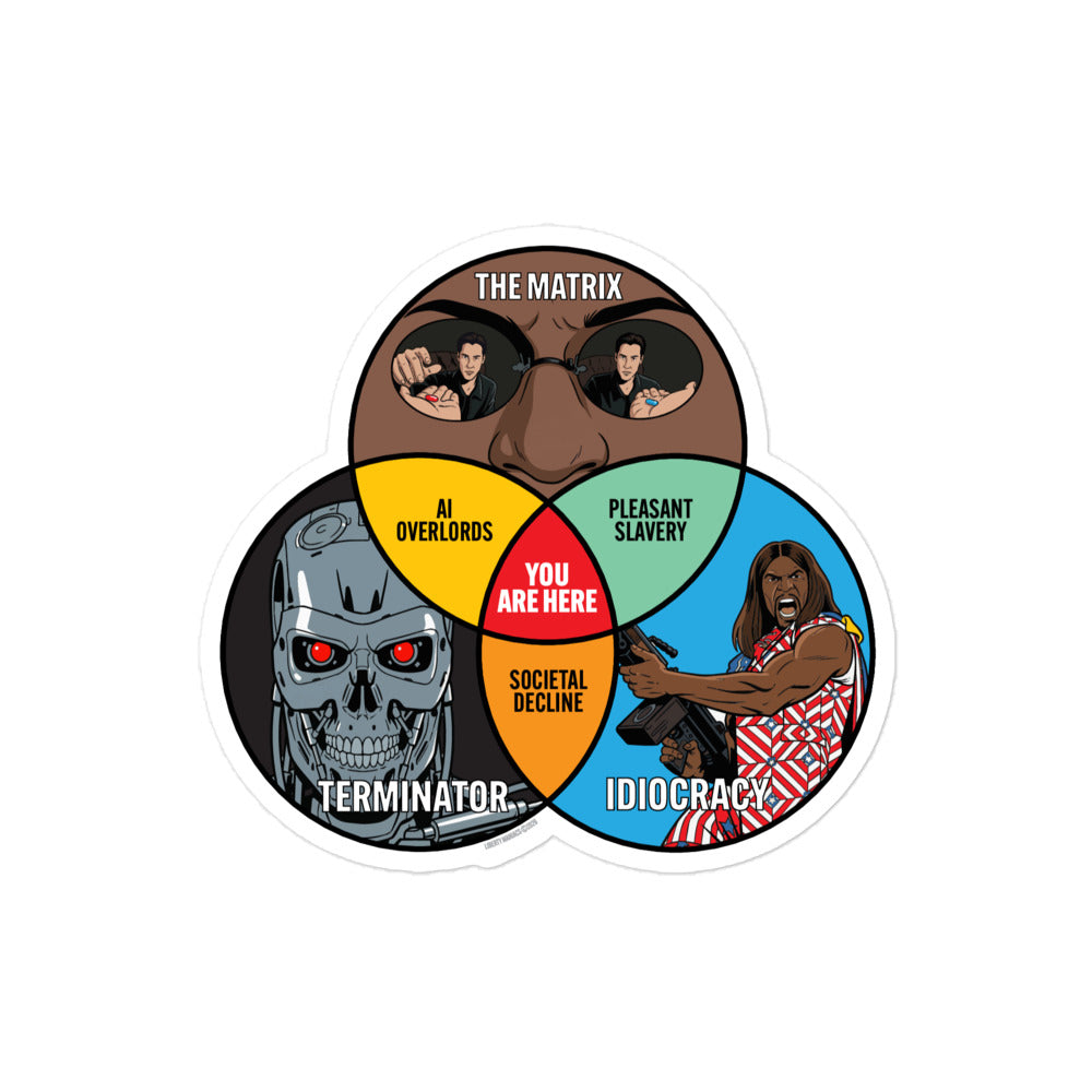 Category: ai overlords, blue pill, cartoon, dystopia, dystopian, engineered decline, funny stickers, hollywood, idiocracy, liberty maniacs, movie, pleasant slavery, red pill, satire, sticker, t-800, terminator, the matrix, you are here