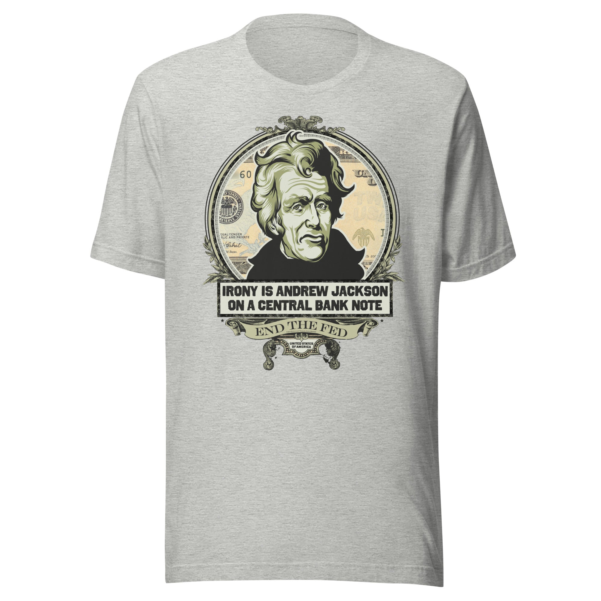 Ah, the "Irony is Andrew Jackson On A Central Bank Note Shirt"! Now there's a historical fashion statement that's as witty as it is sartorially savvy. I mean, c'mon folks, who would've thought that old Hickory, Andrew Jackson himself, the seventh President of these United States, would end up smack dab in the middle of the very thing he spent his political career fighting against - central banking! It's like putting Gandhi on a fast food menu or making a reality TV star the leader of the free world... oh wait, scratch that last one.