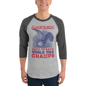 America: Back to Back World War Champs. A stylish spin on the classic baseball raglan. The combed cotton blend makes it super soft, comfortable, and lightweight.