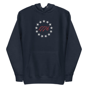 Vintage Betsy Ross flag circle arrangement with of 13 stars with 1776 embroidered on out classic and super comfy pullover hoodie.