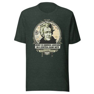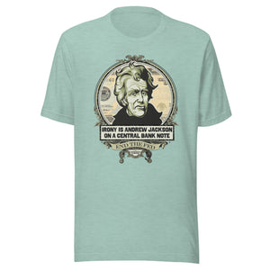Ah, the "Irony is Andrew Jackson On A Central Bank Note Shirt"! Now there's a historical fashion statement that's as witty as it is sartorially savvy. I mean, c'mon folks, who would've thought that old Hickory, Andrew Jackson himself, the seventh President of these United States, would end up smack dab in the middle of the very thing he spent his political career fighting against - central banking! It's like putting Gandhi on a fast food menu or making a reality TV star the leader of the free world... oh wait, scratch that last one.