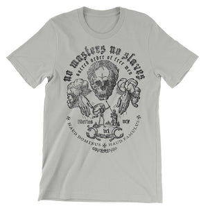 The shirt's design features an ominous death in laurels extending its hands to intervene in a Freeman's demise. Latin text reading "no lord no servant." Printed on quality lightweight combed ringspun cotton shirts in the United States and ships direct.