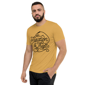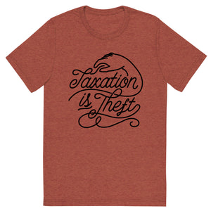 Category: crew neck, graphic tee, libertarian, politics, script, script cursive, stealing, taxation is theft, taxes, triblend, tshirt, typography