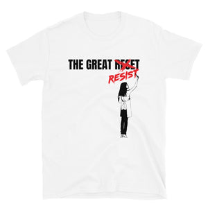 Featuring a bold graphic of a little girl crossing out the word "reset" and replacing it with "resist," this shirt is a powerful statement of defiance against those who seek to control the world for their own gain.