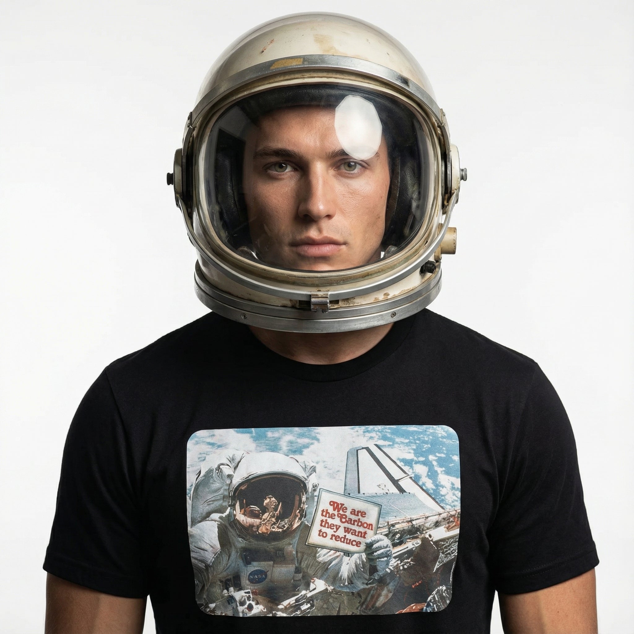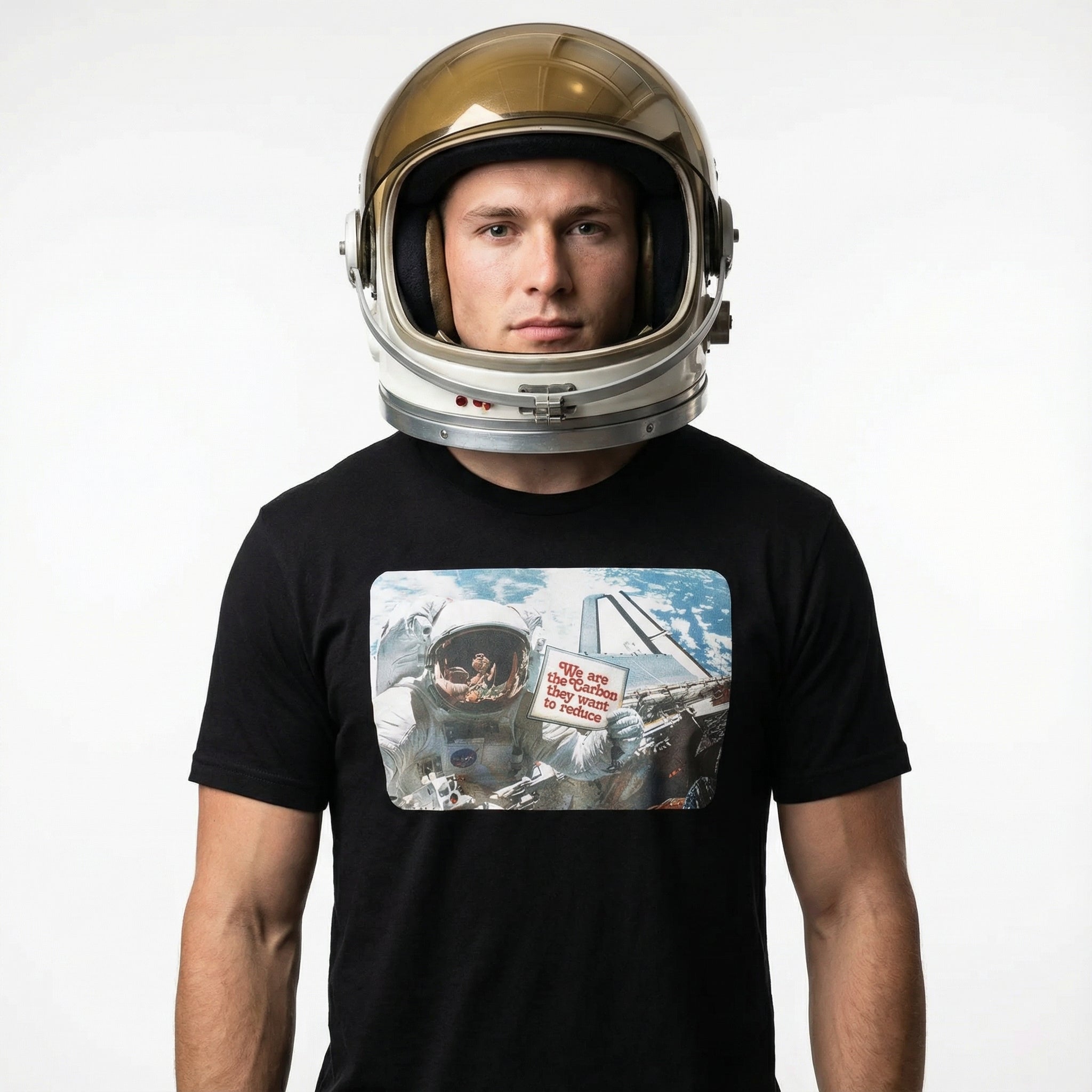 Category: anti globalist, Astronaut, carbon, climate change, elites, environment, eugenics, funny, globalist, holding sign, liberty maniacs, space walk, t-shirt, they want to reduce, we are the carbon
